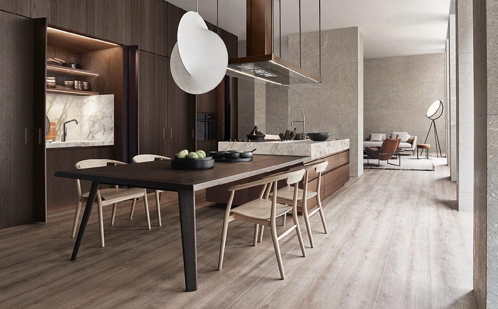 収納はすべて隠し、キッチンを彫刻に仕立て上げるのが、Minotti Cucine流。天然石や木の美しさを生かしたミニマルなキッチンは、物を出し入れする用途なども綿密に計算されて作られています。セミオーダーですが、天然素材が持つ、唯一無二の表情を楽しめるのが魅力です。